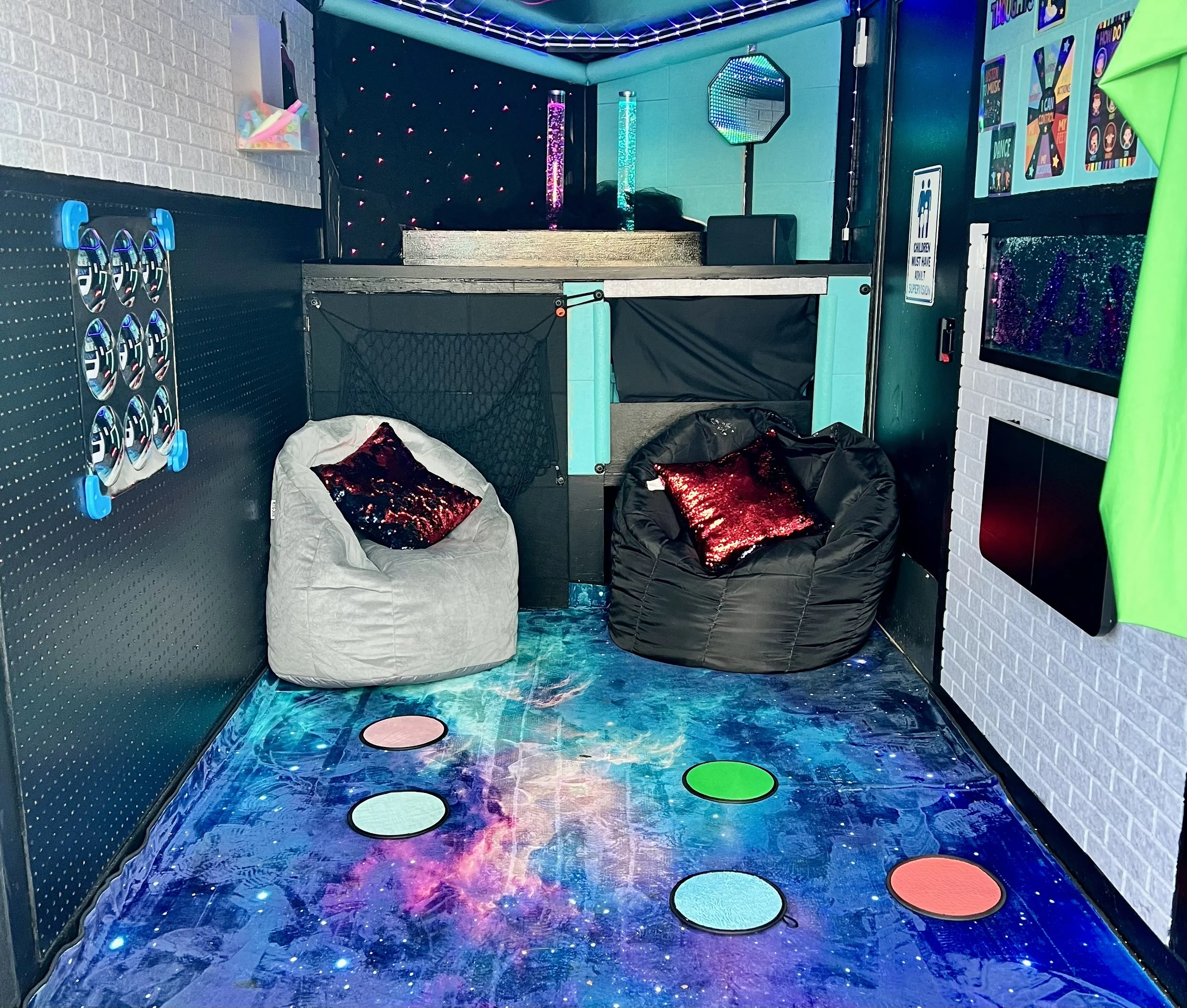 The trailer comfortably accommodates approximately three to four adults or four to six children at a time. For larger events, we may also provide an additional outdoor sensory support area to increase capacity and flow.